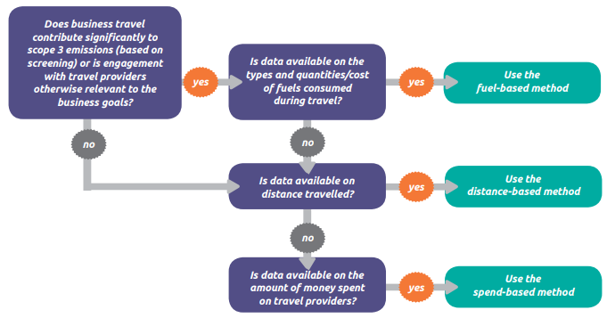 Let’s take, for example, business travel. This is not your employees' commute, a separate Scope 3 emissions, but rather these are employees traveling to meet the business needs of your organization. That decision tree looks something like this: